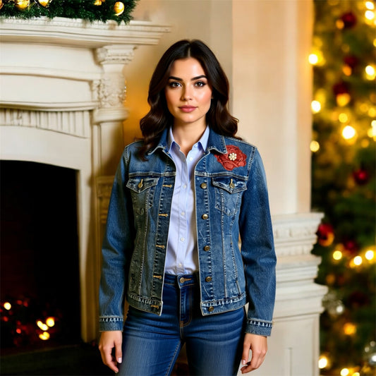 Boho Glam Heirloom Rose – Vintage Needlepoint Upcycled Denim Jacket