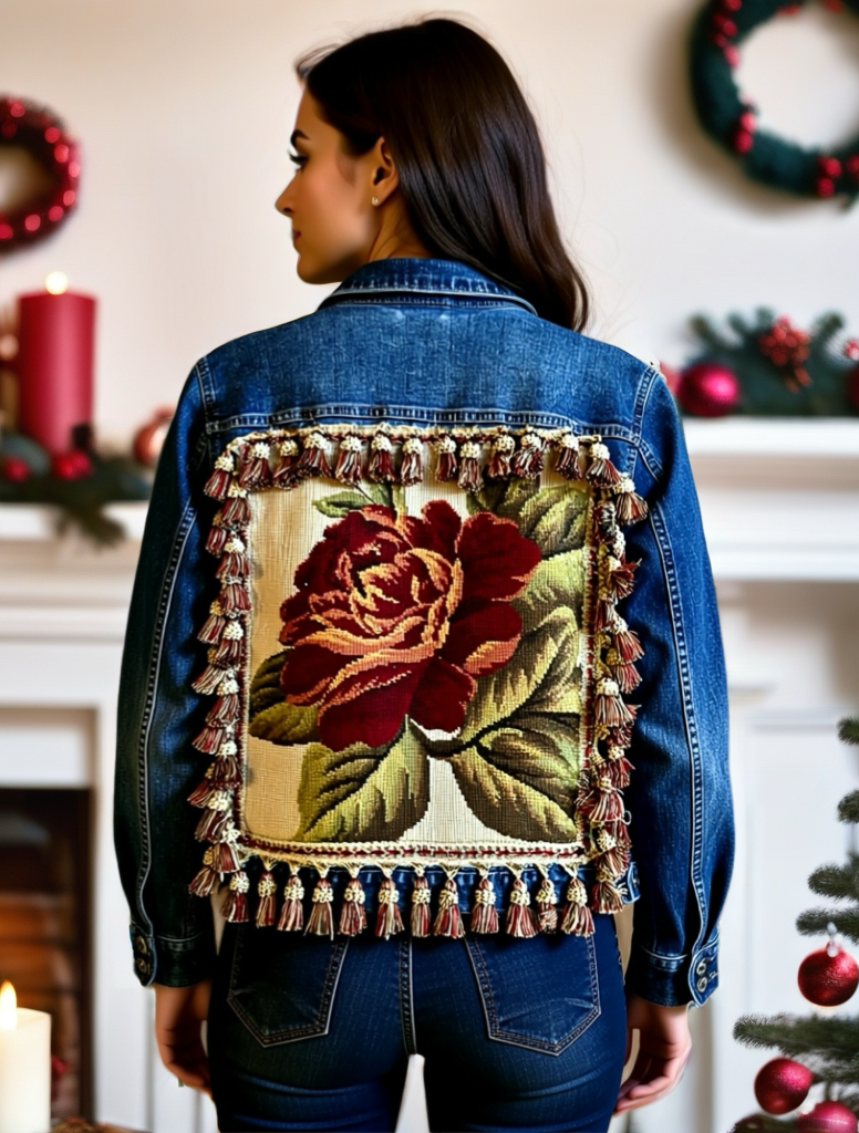 Boho Glam Heirloom Rose – Vintage Needlepoint Upcycled Denim Jacket